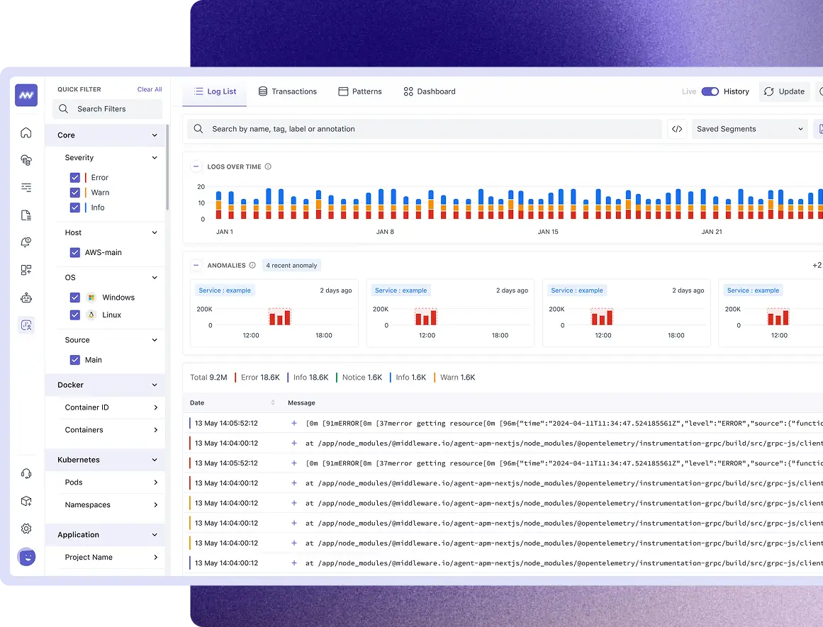 - Correlate logs with corresponding APM traces, metrics with a single click for full context.