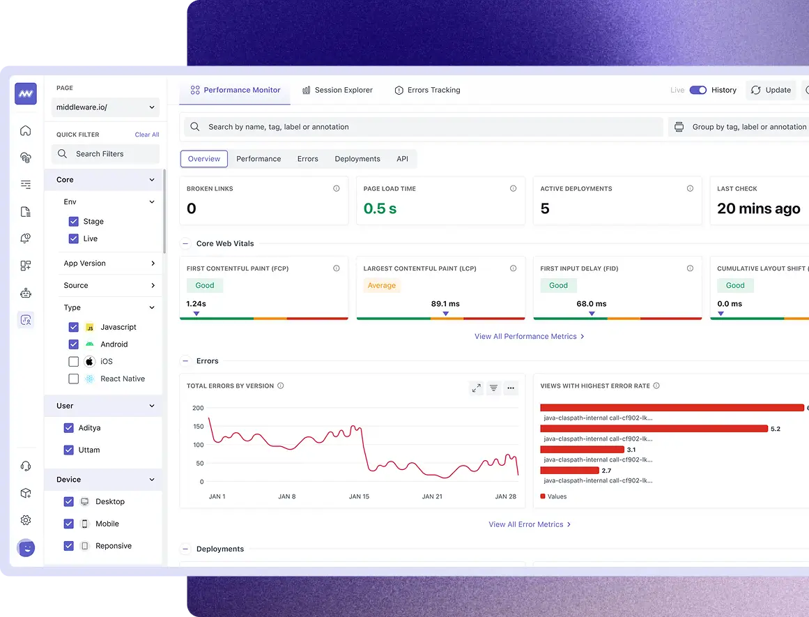 - Knowing errors is good, but fixing them is a must. Middleware RUM monitors front-end performance and understands user behavior, traces and related context to fix issues before they impact the businesses.